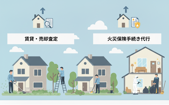 草刈り、剪定、ハウスクリーニング、ごみ撤去、家財処分、害虫駆除、リフォーム解体、賃貸・売却査定、火災保険手続き代行等、都度対応可能です。